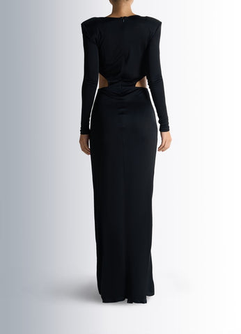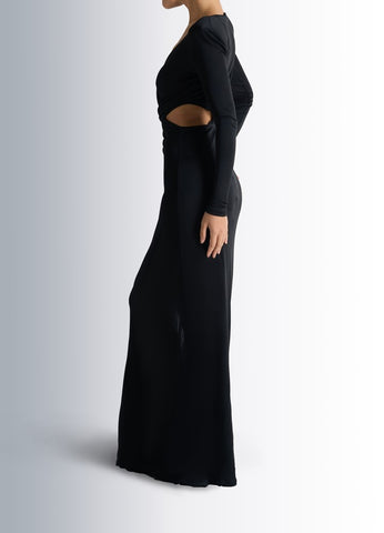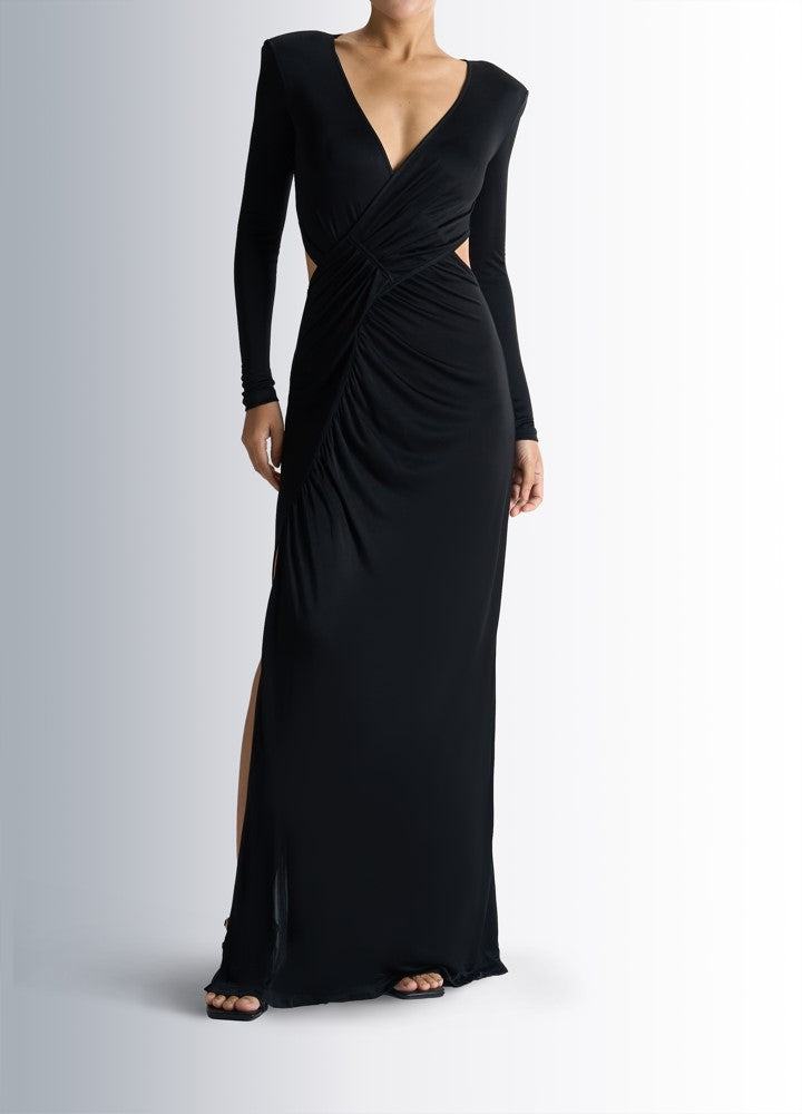 The Gabrielle Dress explores modern femininity through line and movement rather than overt exposure. Cut from a silk-viscose jersey with a soft matte finish, the dress features a deep V-neckline that is precisely engineered to sit securely on the body, offering elegance without vulnerability. The wrap-inspired construction is fully fixed — designed to visually shape and flatter the waist while providing coverage across the midsection. Strategic cut-outs at the sides create lightness and definition, balanced by long sleeves and a floor-length silhouette that keeps the overall expression refined and assured. An evening piece that feels powerful, considered, and effortlessly composed.